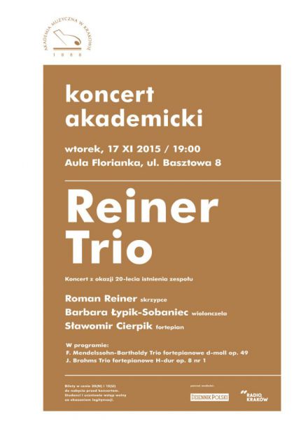 We wtorek, 17 listopada o godz. 19:00 w Auli „Florianka”, dzięki przypadającemu w tym roku jubileuszowi Zespołu kameralnego prowadzonego przez Romana Reinera, cenionego kameralistę, skrzypka i pedagoga Akademii Muzycznej w Krakowie, będziemy mieli okazję obcować z dziełami kameralnymi Feliksa Mendelssohna-Bartholdy’ego oraz Johannesa Brahmsa. Ich muzyka zawsze frapuje oraz, poprzez swoją piękną melodykę i świat harmoniczny, jest chętnie słuchana zarówno przez młodych, jak i dojrzałych i wytrawnych melomanów. Z Jubilatem zagrają: wiolonczelistka Barbara Łypik-Sobaniec oraz pianista Sławomir Cierpik. Bilety w cenie 30(N) i 15(U) do nabycia na godzinę przed koncertem. Studenci i uczniowie wstęp wolny za okazaniem legitymacji.