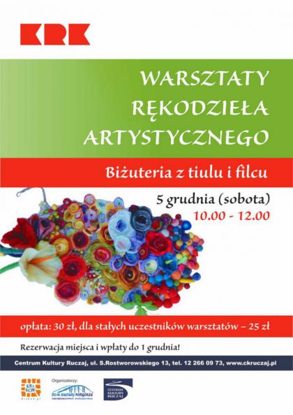 Zapraszamy do Centrum Kultury "Ruczaj" na warsztaty rękodzieła artystycznego. Za pomocą tiulu, filcu i innych materiałów będzie można stworzyć coś niezwykłego i jedynego w swoim rodzaju! W twórczej atmosferze każdy może wykonać coś pięknego dla siebie lub na prezent.