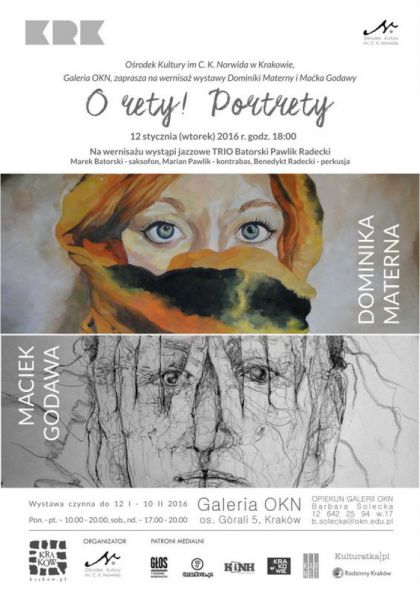Ośrodek Kultury im. C. K. Norwida zaprasza na wernisaż wystawy „ O rety! Portrety ” Dominiki Materny i Macieja Godawy 12 stycznia 2016 r. o godzinie 18.00 do Galerii OKN na os. Górali 5 w Krakowie.