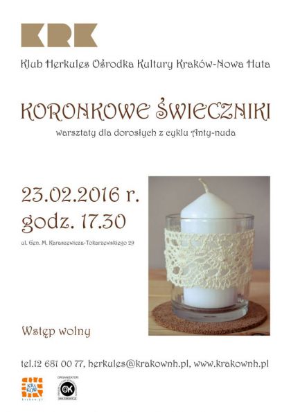 Klub Herkules Ośrodka Kultury Kraków-Nowa Huta (ul. Gen. M. Karaszewicza-Tokarzewskiego 29) zaprasza na kolejne warsztaty dla dorosłych z cyklu Anty-nuda, które odbędą się 23 lutego o godz. 17.30. Masz wolny czas? Przyjdź do nas! Podczas warsztatów nauczymy się jak wykonać koronkowe świeczniki, wykorzystując do tego serwetki. Warsztaty to wspaniała okazja aby wykonać samodzielnie wyjątkową ozdobę do swojego domu.