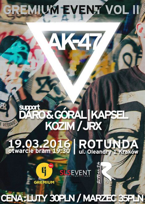 Zapraszamy wszystkich na drugi GremiumEvent vol. II: AK-47 ! Już 19.03.2016 w Rotunda Centrum Kultury przy ul. Oleandry 1 w Krakowie, odbędzie się koncert spod szyldu GremiumEvent! Otwarcie bram 19:30, start koncertów 20:30 Zagra dla Was Ak-47 (Official Fanpage PL) wsparty przez ludzi współpracujących z GremiumRec. - Daro & Góral - Kozim / JRX – Kapsel