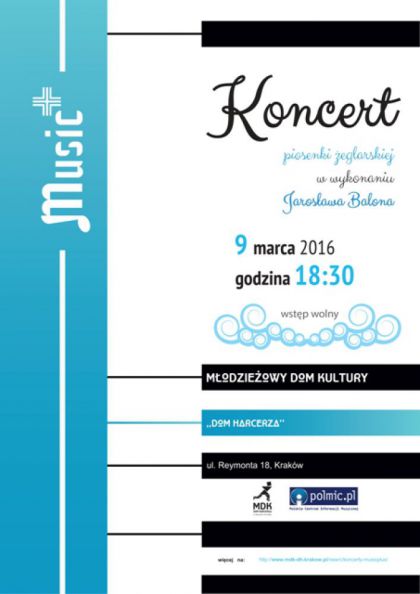 Koncert piosenki żeglarskiej w wykonaniu Jarosława Balona odbędzie się 9 marca o godzinie 18.30 w Młodzieżowym Domu Kultury „Dom Harcerza”, ul. Reymonta 18.