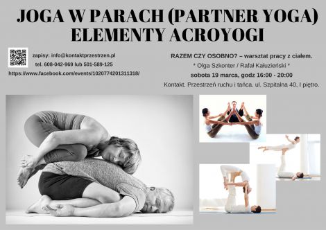 Sprawdzimy jakie korzyści daje taka forma praktyki, zadbamy o wzmocnienie i rozciągnięcie ciała w ćwiczeniach z partnerem/partnerką, spróbujemy niezwykłych i ekscytujących pozycji acroyogi i będziemy dobrze się bawić w kontakcie z innymi :-)