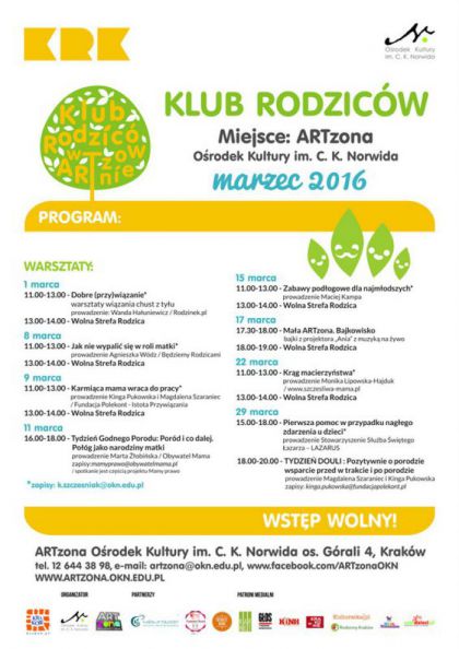 Klub Rodziców w ARTzonie zrealizowany dzięki wsparciu Biura Pełnomocnika PMK ds. Rodziny oraz Gminy Miejskiej Kraków.