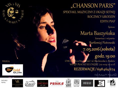 W wyjątkowym programie „CHANSON PARIS” - najpiękniejsze piosenki Edith Piaf, francuskie szlagiery oraz przeboje Ewy Demarczyk, a także wiersze Jacquesa Preverta i Haliny Poświatowskiej - zaśpiewa Gwiazda scen muzycznych, artystka Teatru VIS a VIS - Marta Baszyńska.