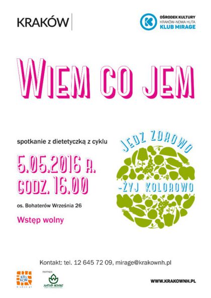 Klub Mirage Ośrodka Kultury Kraków-Nowa Huta (os. Bohaterów Września 26) zaprasza na spotkanie Wiem co jem w czwartek 5 maja o godz. 16.00. Jedz zdrowo – żyj kolorowo to cykl spotkań dla seniorów promujący zdrowy styl życia. Odżywianie seniora to nie tylko liczenie kalorii. Zbilansowana dieta i aktywność fizyczna przyczyniają się do lepszej jakości życia i braku chorób. Uczestnicy spotkań dowiedzą się jakie składniki w diecie będą przeciwdziałać problemom ze zdrowiem, a których należy się wystrzegać, oraz jak ograniczyć ryzyko niedoboru witamin. Dietetycy pokażą jak komponować posiłki, aby wspomagały sprawność fizyczną, psychiczną oraz spowalniały procesy starzenia. Spotkania poprowadzą eksperci z Centrum Dietetycznego Naturhouse - światowego lidera w dziedzinie dietetyki i żywienia.