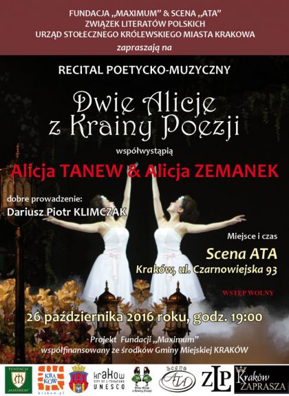 Projekt Fundacji "MAXIMUM" polegający na organizacji, promocji i wystawieniu spektaklu poetycko-muzycznego „DWIE ALICJE w KRAINIE POEZJI” na motywach liryki krakowskich poetek Alicji TANEW i Alicji ZEMANEK. Całość imprezy poprowadzi wybitny znawca poezji (i poetek) Dariusz Piotr KLIMCZAK. Zadanie adresowane do mieszkańców Krakowa jako MIASTA LITERATURY połączone jest z promocją krakowskich literatów należących do Związku Literatów Polskich oraz muzyków i kompozytorów krakowskich. Realizacja niebiletowanego literacko-muzycznego wydarzenia kulturalnego nawiązuje do tradycji krakowskich kabaretów i imprez artystycznych.