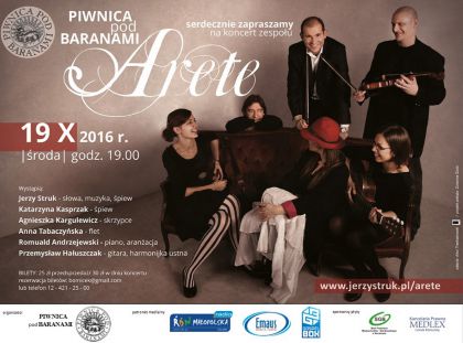 Serdecznie zapraszamy do pięknego Krakowa na koncert zespołu Arete w PIWNICY POD BARANAMI 19 października (środa), 2016r. godz. 19.00