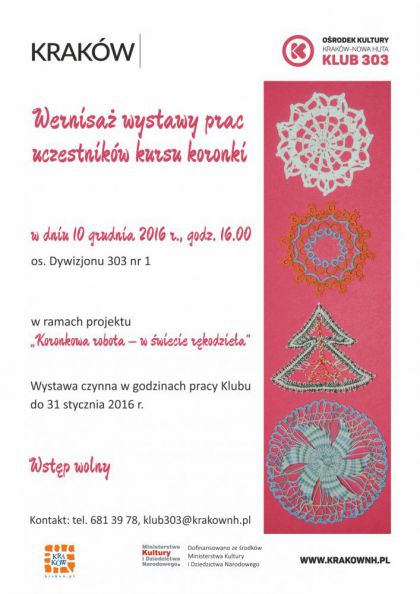 Klub 303 Ośrodka Kultury Kraków-Nowa Huta (os. Dywizjonu 303 nr 1) zaprasza 10 grudnia o godz. 16.00 na wernisaż wystawy pt. Koronkowa robota, która jest podsumowaniem rocznej pracy uczestników biorących udział w bezpłatnym cyklu warsztatów koronczarskich. Podczas warsztatów uczestniczki poznały podstawy wykonywania czterech rodzajów koronki: szydełkowej, czółenkowej, igłowej oraz klockowej. Niniejsza wystawa jest owocem 120 godzin twórczej, a jednocześnie trudnej, lecz satysfakcjonującej pracy. W trakcie trwania warsztatów część uczestników warsztatów zmieniała się w zależności od osobistych zainteresowań, jednak największe pasjonatki wytrwały od początku do końca przechodząc przez wszystkie etapy kursu. Na wystawie będzie można zobaczyć prace uczestniczek oraz Mistrzyni Jadwigi Węgorek.