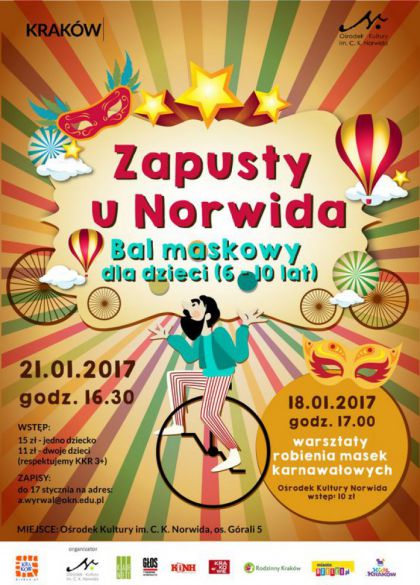 Karnawał to wspaniały, radosny czas. Tańce, hulańce i zabawy do białego rana - dorośli dobrze to znają :) Ale co z dziećmi? Co one wiedzą o karnawale? Postanowiliśmy przybliżyć im nieco tę tradycję i zaprosić na bal maskowy do Norwida! Zapowiada się najlepsza impreza dla dzieci w Krakowie! Kolorowe stroje, muzyka i moc zabawy pod okiem najfajniejszych animatorów zabaw dziecięcych.
