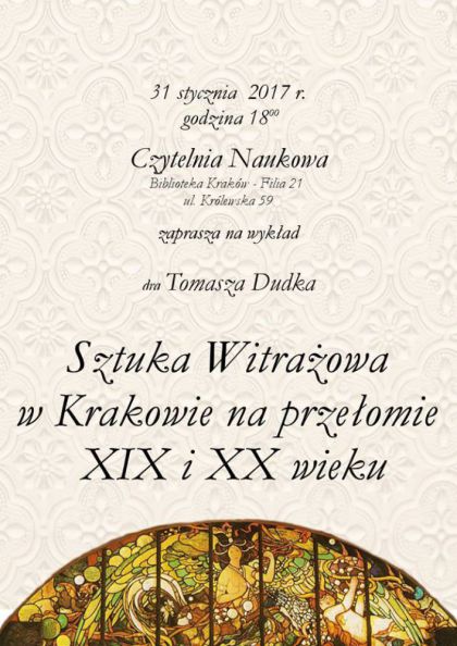 Wykład będzie poświęcony krakowskim witrażom na przełomie XIX i XX w. To szalenie ciekawy, a zarazem bardzo mało znany temat. Wędrując ulicami naszego miasta, co róż możemy napotkać witraże z tego okresu. W lepszym lub gorszym stanie cieszą one oko współczesnych mieszkańców naszego i turystów. Autor przedstawi zarówno witraże o tematyce sakralnej tak znanych twórców jak np. Józef Mehoffer, czy Stanisław Wyspiański oraz witraże o tematyce świeckiej projektowane np. przez nieco zapomnianego artystę Stefana Matejkę. Wykład będzie bogato zilustrowany przeźroczami na których przedstawiono wybrane krakowskie witraże.