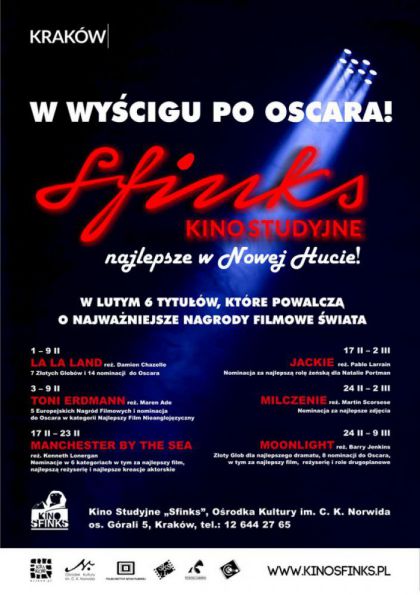 „La La Land” z Ryanem Goslingiem i Emmą Stone w rolach głównych zdobył 7 Złotych Globów i 14 nominacji do Oscara - we wszystkich najważniejszych kategoriach! (gramy 27 II – 9 I). „Toni Erdman” w reżyserii Maren Ade zdominował galę rozdania Europejskich Nagród Filmowych i powalczy o Oscara w kategorii Najlepszy Film Nieanglojęzyczny (3-9 II). „Manchester by the See” w reżyserii Kennetha Lonergana, w którym wystąpili Casey Afleck i Michelle Williams, został nominowany w 6 kategoriach – w tym za najlepszy film, najlepszą reżyserię i najlepsze kreacje aktorskie (17-23 II). Faworytką w biegu po Oscara za Najlepszą Rolę Żeńską jest Natalie Portman za znakomitą kreację w filmie „Jackie” (17 II – 2 III). 8 nominacji, w tym za najlepszy film i reżyserię ma rewelacyjny „Moonlight”, który wcześniej zdobył Złoty Glob dla najlepszego dramatu i ponad 100 innych nagród (24 II – 9 III). W repertuarze Sfinksa znalazło się także „Milczenie”, najnowszy film Martina Scorsese – nominowany za najlepsze zdjęcia (24 II – 2 III). Serdecznie zapraszamy – bo jest co oglądać!