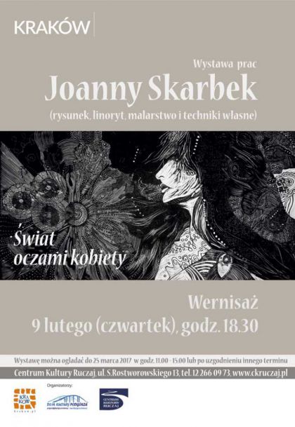 Joanna Skarbek - urodziła się w 1981 roku w Krakowie. Jest absolwentką XX Liceum Ogólnokształcącego w Krakowie. W latach 2000-2005 studiowała na Uniwersytecie Pedagogicznym w Krakowie, na kierunku Edukacja Artystyczna w Zakresie Sztuk Plastycznych. Uzyskała dyplom z wynikiem bardzo dobrym w pracowni profesora J. Jędrysiaka (specjalizacja: linoryt). Praca dyplomowa została zaprezentowana na zbiorowej wystawie ,,DYPLOMY 2005” w Nowohuckim Centrum Kultury w Krakowie zorganizowanej przez Wydział Sztuki na Uniwersytecie Pedagogicznym. Jej zainteresowania plastyczne sięgają także malarstwa oraz rzeźby, z których to dziedzin także wykonuje swoje prace. Od 2012 r. jest członkiem Związku Polskich Artystów Plastyków w Krakowie.