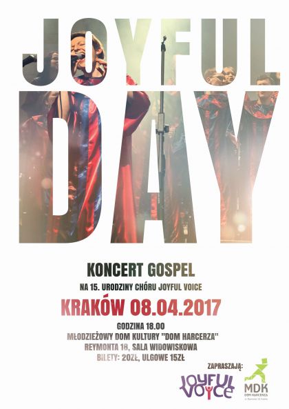 Chór gospel Joyful Voice wraz ze swoim zespołem muzycznym zaprasza na urodzinowy koncert z okazji 15-lecia działalności, który odbędzie się 8 kwietnia (w sobotę) o godzinie 18:00 w Młodzieżowym Domu Kultury “Dom Harcerza” przy ulicy Reymonta 18 w Krakowie.