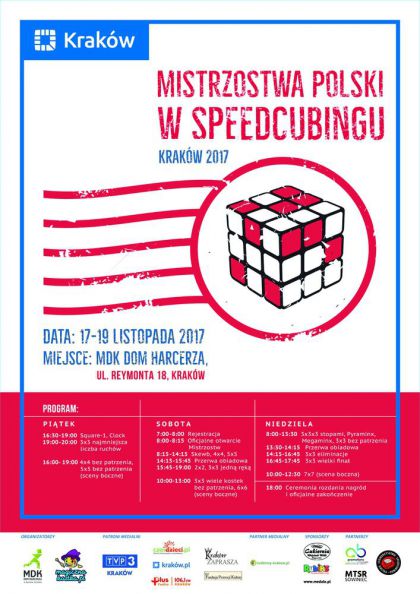 W tym roku w ramach Mistrzostw Polski w Speedcubingu Kraków 2017 wyłonieni zostaną mistrzowie Polski z 18 oficjalnych konkurencji speedcubingowych. Podczas trzech dni Mistrzostw udział w konkurencjach weźmie około 150 zawodników z Polski i świata oraz około 200 widzów.