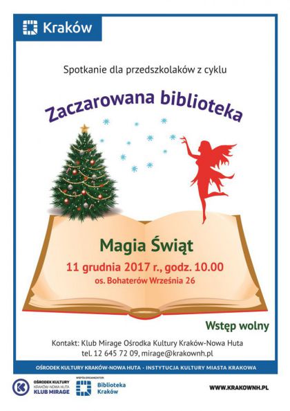 Klub Mirage Ośrodka Kultury Kraków-Nowa Huta (os. Bohaterów Września 26) zaprasza dzieci na kolejne spotkanie w Zaczarowanej bibliotece w poniedziałek 11 grudnia o godz. 10.00. Święta Bożego Narodzenia są najpiękniejszymi świętami, na które czekają nie tylko dzieci, ale i dorośli. Są to święta najbliższe i najdroższe naszym sercom, gdyż towarzyszy im niepowtarzalna i wyjątkowa atmosfera. Jest to również okazja do wspólnego spędzenia czasu w gronie najbliższych nam osób. Ten „magiczny czas” stał się inspiracją do tego, aby zaprosić przedszkolaki na spotkanie przy świątecznej choince. Będzie to okazja do poznania zapomnianych już tradycji związanych z Bożym Narodzeniem, wykonania ozdób choinkowych oraz wspólnego kolędowania. Mamy nadzieję, że świąteczny wystrój sali, zapach świerkowych gałązek, melodie kolęd sprawią, iż wszystkim udzieli się ten „magiczny” świąteczny nastrój i będzie trwał aż do Świąt.