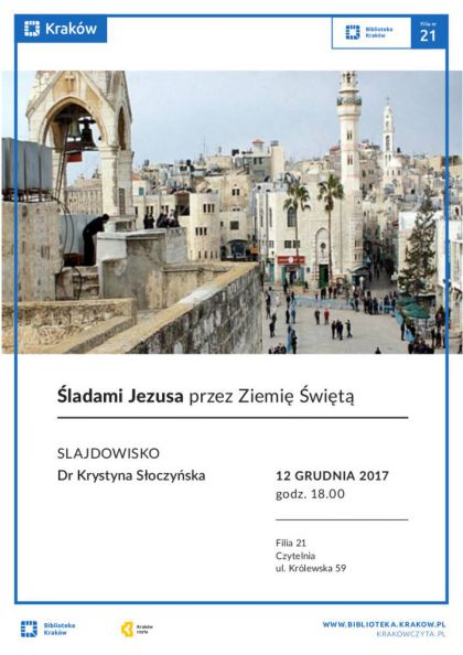 Prezentacja dr Krystyny Słoczyńskiej poświęcona podróżom do Izraela. Podczas spotkania wyświetlane będą liczne zdjęcia dokumentujące przygody prelegentki. Krystyna Słoczyńska jest absolwentką Akademii Górniczo-Hutniczej (Wydział Ceramiczny, doktorat z fizykochemii ciała stałego). Interesuje się historią sztuki, kulturoznawstwem, religioznawstwem oraz podróżami. Dla znajomych jest skarbnicą wiedzy. Jej największa turystyczna fascynacja to Izrael, który odwiedzała siedemnaście razy oraz Sahara, na którą odbyła sześć dwutygodniowych ekspedycji. Większość jej podróży zilustrowana jest przy pomocy pokazu slajdów, niektóre opisane zostały w formie dziennika podróży lub listu do znajomych.