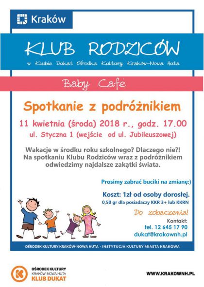 Klub Dukat Ośrodka Kultury Kraków-Nowa Huta (ul. Styczna 1) zaprasza 11 kwietnia w godz. 17.00-18.30 na „Spotkanie z podróżnikiem”, podczas którego posłuchamy o zakątkach świata, do których docierają tylko najwytrwalsi. Gości kolejnej edycji Baby Cafe nie interesują wycieczki w stylu „all inclusive”. Para podróżników mówi o sobie: "Staramy się unikać utartych szlaków i metropolii, ciągnie nas do natury. Dzielimy się swoimi przygodami, wskazówkami i dobrymi radami - co, gdzie i jak”. W oczekiwaniu na czas letniego odpoczynku warto już teraz posłuchać o odległych krainach i poszukać inspiracji przed planowaniem własnych wakacyjnych wojaży.