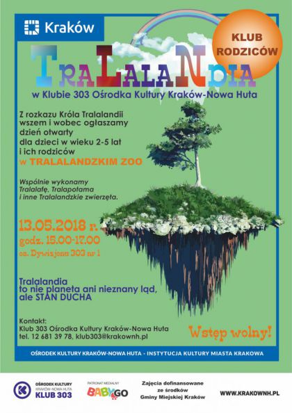 Klub 303 Ośrodka Kultury Kraków-Nowa Huta (os. Dywizjonu 303 nr 1) zaprasza na kolejną wyprawę do świata Tralalandii w niedzielę 13 maja o godz. 15.00. Tralalandia powoli odzyskuje swój dawny wygląd… Nowi mieszkańcy już się zadomowili, poznali muzyczną stronę nieznanej krainy. Teraz pora odnaleźć pozostałych mieszkańców Tralalandii, czyli zwierzęta. Podczas kolejnego spotkania w ramach Klubu Rodziców pokonamy zarośla, lasy i łąki, aby odnaleźć je w… naszej wyobraźni. Wspólnie spróbujemy zbudować Tralalandzkie ZOO, stworzymy Tralalafę, Tralarysa, Tralapotama i wiele innych dotąd nieodkrytych zwierząt.