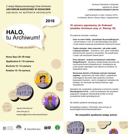 Jest to cykl spotkań edukacyjnych, organizowanych przez Archiwum Narodowe w Krakowie z okazji Międzynarodowego Dnia Archiwów 2018. Zajęcia w Krakowie będą odbywały się w dn. 15–16 czerwca 2018 r. w siedzibie Archiwum Narodowego w Krakowie (30–960 Kraków, ul. Sienna 16).
