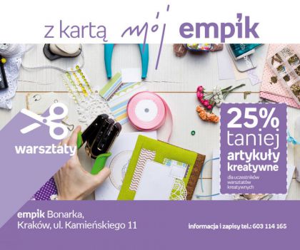 Z okazji 70-lecia Empiku zapraszamy w podróż do przeszłości Krakowa i naszych salonów, które nosiły kiedyś nazwę Klubów Międzynarodowej Prasy i Książki. Podczas warsztatów wykonamy ramki z grafiką lub kolaże; obrazy inspirowane dziejami miast i historią Empiku oraz pielęgnowanej w nim kultury. Może te zajęcia przywołają obrazy z Twojej przeszłości albo z życia kogoś z Twoich bliskich? Wiek 10+