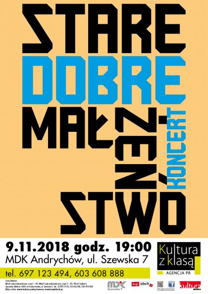 Stare Dobre Małżeństwo to najbardziej rozpoznawalny zespół z kręgu piosenki poetyckiej i ballady folkowej w Polsce, od przeszło trzech dekad prowadzony przez Krzysztofa Myszkowskiego - charyzmatycznego pieśniarza, kompozytora i autora o studenckim rodowodzie. Najnowsza płyta SDM zatytułowana Blizny czasu jest kolejną intymną opowieścią lidera grupy, wysnutą z wnikliwych obserwacji samego siebie. Powstałą w zgodzie z własnym sumieniem artysty oraz wedle subiektywnych kanonów mądrości i piękna. Poza wszelkim możliwym wpływem i opiniotwórczym obiegiem. Występy tej legendarnej formacji stanowią atrakcję koncertową na niespotykaną dotąd skalę. Stare Dobre Małżeństwo regularnie zapełnia największe i najbardziej prestiżowe sale koncertowe w kraju. Publiczność zespołu dojrzewając z nim, podąża wiernie jego śladem, co stanowi wartość najwyższą z możliwych.
