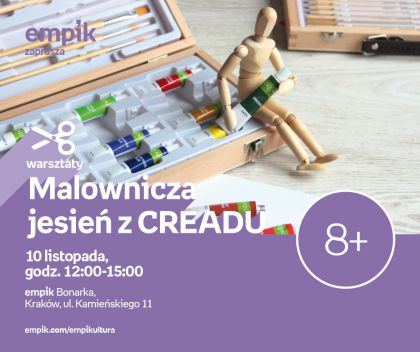 Jak stworzyć niebanalny pejzaż jesienny? Pod okiem prowadzących uczestnicy dowiedzą się, jak wyczarować nastrój zadumy albo miejski ruch na obrazach. Artystyczne dusze nauczą się kilku trików pozwalających w prosty sposób uzyskać spektakularne efekty wizualne. Przy okazji będzie możliwość przetestowania najnowszych zestawów do tworzenia barwnych ilustracji – kredek, mazaków i farb Creadu. Podczas tych warsztatów każdy może zostać artystą!