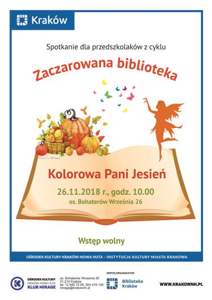 Klub Mirage Ośrodka Kultury Kraków-Nowa Huta (os. Bohaterów Września 26) zaprasza 26 listopada na godz. 10.00 na kolejne spotkanie w Zaczarowanej bibliotece, podczas którego przedszkolaki wraz z Panem Listopadem dowiedzą się jakie niespodzianki przygotowała dla nich Pani Jesień. Orzechy i kolorowe liście mieniące się w słonecznych promieniach czy raczej chłód i deszcz, czyli jesienną szarugę?