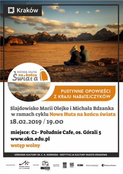 Ośrodek Kultury im. C. K. Norwida zaprasza na slajdowisko Marii Olejko i Michała Rdzanka pt. „Pustynne opowieści z kraju Nabatejczyków” w ramach cyklu „Nowa Huta na końcu świata”. Wstęp wolny.
