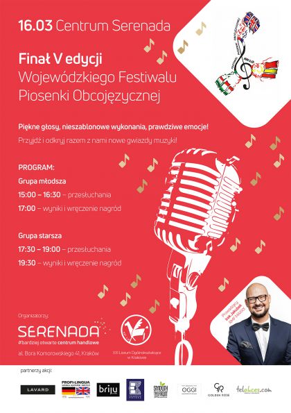 W najbliższą sobotę krakowska Serenada zamieni się w wypełnioną emocjami salę koncertową. Już 16 marca o godzinie 15.00 przy al. Bora-Komorowskiego 41 odbędzie się wielki Finał Konkursu Piosenki Obcojęzycznej organizowany przez XXI Liceum Ogólnokształcące im. Stanisława Ignacego Witkiewicza-Witkacego w Krakowie oraz Centrum Serenada. Wydarzenie poprowadzi Irek Jakubek – popularny prezenter związany z RMF MAXXX.