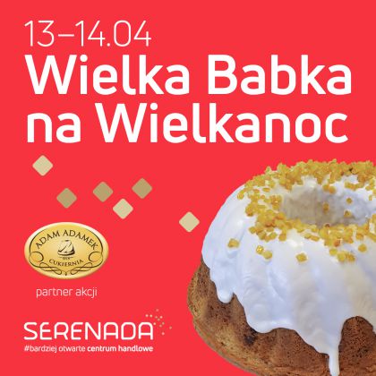 W terminie 13 - 14 kwietnia, za każde zakupy o wartości co najmniej 300 zł, udokumentowane maksymalnie dwoma paragonami, klienci Centrum Serenada otrzymają wielką babkę wielkanocną, przygotowaną przez Cukiernię Adam Adamek.