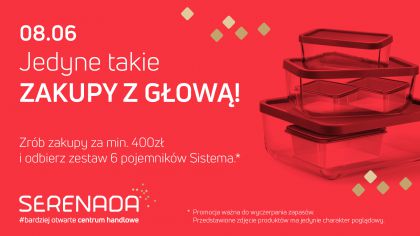 Już w najbliższą sobotę – 8 czerwca, klienci Serenady będą mieli okazję wziąć udział w wyjątkowej akcji promocyjnej. Po zakupach i okazaniu paragonów na minimum 400 zł będą mogli odebrać specjalny upominek – zestaw sześciu pojemników lunchowych firmy Sistema. Praktyczny zestaw pojemników z wygodnym zamknięciem idealnie nadaje się do przechowywania żywności. Sprawdzi się nie tylko w pracy czy szkole, ale może być również komfortowym gadżetem piknikowym.