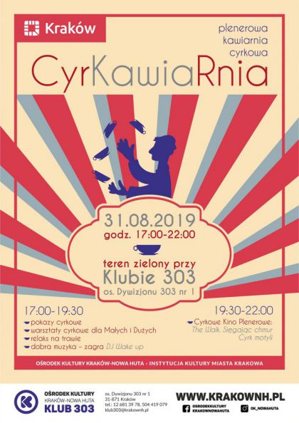 W sobotę 31 sierpnia w godzinach 18.00-22.00 Klub 303 Ośrodka Kultury Kraków-Nowa Huta (os. Dywizjonu 303 nr 1) już po raz piąty zaprasza do cyrkowej kawiarni plenerowej. W CyrKawiaRni goście będą mogli usiąść przy stolikach, na kocykach i poduszkach, zamówić nieodpłatnie bezalkoholowe tematyczne drinki np. Raj dla cyrkowca, Clown z głową w chmurach, Skok Akrobaty i zdrowe przekąski. Ponadto będzie udostępniony grill, do przygotowania przez uczestników we własnym zakresie drobnych przekąsek. Strefa odpoczynku przy klimatycznej muzyce będzie wzbogacana pokazami cyrkowymi na mini scenie. Wystąpią: w spektaklu cyrkowym Nibyluk. Słońce w kuli Cyrk-O-Maniacy z Klubu 303, w pokazie na Kole Reńskim Julia Bogusław - uczennica trzeciego roku Państwowej Szkoły Sztuki Cyrkowej w Julinku, w pokazie na drabinie cyrkowej - Tomasz Krawczyk, uczestnik a następnie instruktor zajęć cyrkowych w Klubie 303, obecnie uczeń pierwszego roku Państwowej Szkoły Sztuki Cyrkowej w Julinku. Od godziny 19.30 Goście CyrKawiaRni będą mieli okazje zrelaksować się i obejrzeć filmy w plenerowym kinie. Wydarzeniu towarzyszyć będzie także promocja działań Klubu 303 na rok 2019/2020.