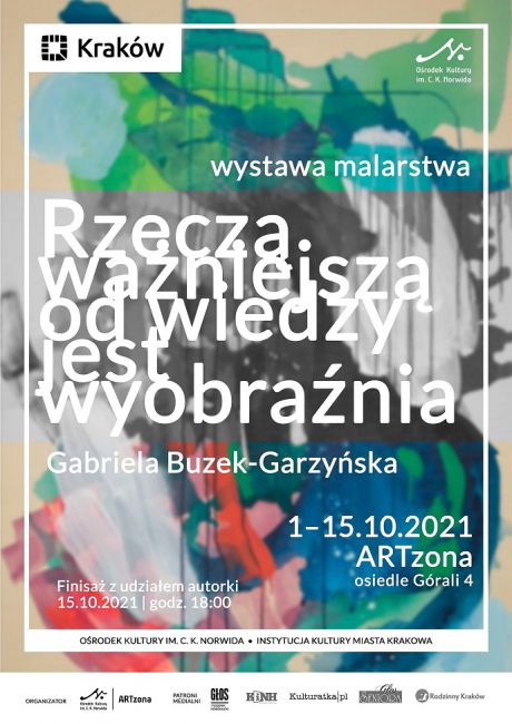 ARTzona Ośrodka Kultury im. C.K. Norwida (os. Górali 4) zaprasza od 1 października 2021 r. do swojej przestrzeni galeryjnej na wystawę malarstwa pt. „Rzeczą ważniejszą od wiedzy jest wyobraźnia” autorstwa Gabrieli Buzek-Garzyńska. Finisaż wystawy z udziałem autorki odbędzie się 15 października 2021 r. o godz. 18.00.