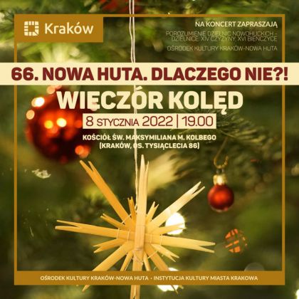Tuż po gorącym okresie Świąt Bożego Narodzenia – 8 stycznia o godz. 19.00, Organizatorzy cyklu Nowa Huta. Dlaczego Nie?! zapraszają do wspólnego kolędowania w Kościele pw. Maksymiliana Marii Kolbego (os. Tysiąclecia 86). Spotkanie będzie okazją do przedłużenia radosnego klimatu Świąt i przypomnienia sobie zapomnianych zwrotek kolęd. W trakcie wydarzenia wystąpią: soliści Magda Niedbała-Solarz i Piotr Kwinta, Chór Gaudium, Bocheński Chór Kameralny Salt Singers, Chór Dominanta, Krakowska Młoda Filharmonia pod batutą Tomasza Chmiela. Dodatkowo podczas koncertu odbędzie się kwesta na rzecz Hospicjum Św. Łazarza.