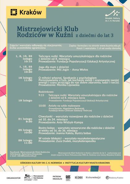 Wszystkie zajęcia odbywają się stacjonarnie – Klub Kuźnia Ośrodka Kultury im. C. K. Norwida, os. Złotego Wieku 14. Obowiązują zapisy na stronie www.kuznia.edu.pl, zakładka Mistrzejowicki Klub Rodziców. Formularz zapisów będzie dostępny od 27.01.2022 r., od godziny 11:00.
