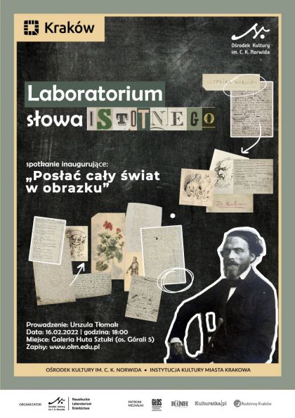 „Laboratorium słowa istotnego” to cykl spotkań skupionych wokół interpretacji słowa poetyckiego i twórczości literackiej. Na inaugurujące spotkanie zapraszamy poezję Norwida, szczególnie przyjrzymy się cyklowi poetyckiemu „Vade-mecum”. Jednym z ważniejszych wątków tego zbioru jest temat człowieka jako istoty ukształtowanej przez historię, cywilizację i naturę. Bohater tych utworów poetyckich, uwikłany jest w relacje z otoczeniem – zbiorowością, cywilizacją, a tragizm jego poczynań polega na niemożności nawiązania kontaktu, braku porozumienia z innymi ludźmi.