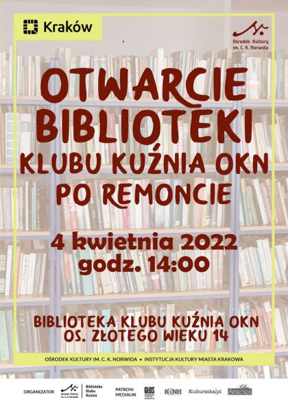 Od listopada 2021 roku Biblioteka Klubu Kuźnia OKN był nieczynna dla Czytelników ze względu na modernizację, ukierunkowaną na podniesienie jakości świadczonych usług bibliotecznych. Od kwietnia br. Czytelnicy będą mogli korzystać z Biblioteki w następujących dniach i godzinach: