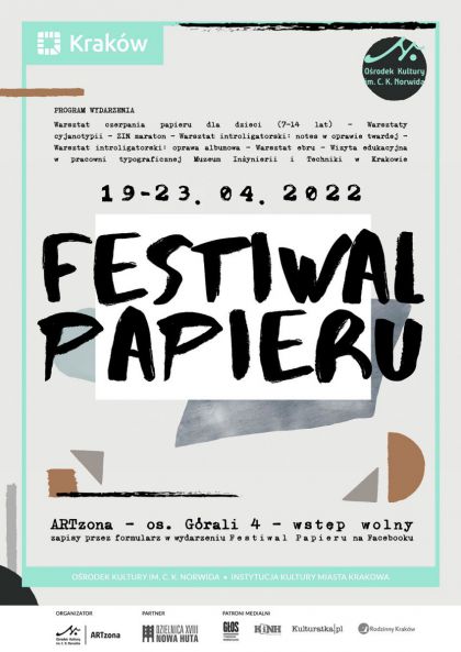 Festiwal Papieru to tygodniowe wydarzenie podczas którego będą mieć miejsce warsztaty edukacyjno-rzemieślnicze związane z medium, jakim jest papier. Odbędą się m.in. warsztaty introligatorskie, czerpanie papieru, warsztat ebru oraz wizyta edukacyjna w pracowni typograficznej Muzeum Inżynierii Miejskiej.