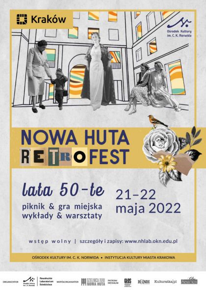 Zapraszamy na pierwszą edycję NOWA HUTA RETRO FEST 50’s w dniach 21-22 V 2022. W programie znajdują się warsztaty szycia spódnicy z koła, gra miejska związana z nowohuckimi postaciami, webinar o kobiecej modzie lat 50. w polskich realiach oraz rodzinny piknik w Parku Ratuszowym z retro grami i koncertem Nowa Huta Mish Mash Band. Motywem przewodnim tegorocznej edycji są lata 50. XX w., czyli okres w którym powstawała dzielnica.
