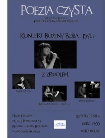 Dwór Czeczów zaprasza na koncert pt. Poezja czysta. Wieczór z poezją prof. Bogusława Żurakowskiego w wykonaniu Bożeny Boby-Dygi wraz z zespołem.