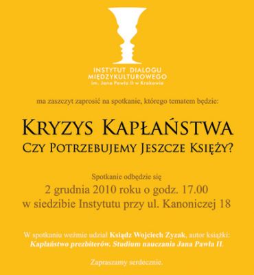 Odbędzie się ono 2 grudnia 2010 o godzinie 17:00, w siedzibie Instytutu przy ulicy Kanoniczej 18. Temat naszej dyskusji nawiązuje do książki: Kapłaństwo prezbiterów. Studium nauczania Jana Pawła II. W spotkaniu weźmie udział Ksiądz Wojciech Zyzak, autor książki. W swej monografii ksiądz Zyzak omówił szeroko takie tematy jak: tożsamość prezbitera, Bóg jako źródło kapłaństwa, miejsce i rola prezbitera we wspólnocie Kościoła, misja kapłana, jego duchowość i formacja. Można powiedzieć, że jest to jak dotąd najbardziej źródłowe, obszerne i wyczerpujące studium tematu kapłaństwa w nauczaniu Ojca Świętego. Książka ta stanowi jednocześnie przystępny i wieloaspektowy podręcznik duchowości kapłańskiej, który winien znaleźć się przede wszystkim w bibliotece każdego prezbitera.