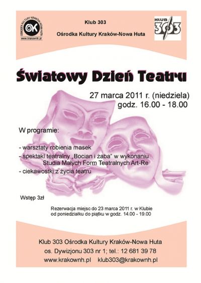 Klub 303 Ośrodka Kultury Kraków – Nowa Huta zaprasza dzieci na imprezę z okazji Światowego Dnia Teatru, która odbędzie się 27 marca 2011 r. (niedziela) o godz. 16.00.
