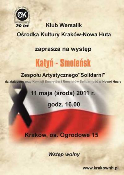 Program słowno - muzyczny w wykonaniu Zespołu Artystycznego ”Solidarni” działającego przy Komisji Emerytów i Rencistów Solidarność w Nowej Hucie, upamiętniający tragedie w Katyniu i Smoleńsku.