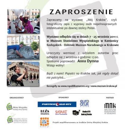 Serdecznie zapraszamy na Wystawę Fotograficzną „Mój Kraków” – nasze miasto w obiektywie osób niepełnosprawnych intelektualnie, organizowaną przez „Republikę Marzeń” Fundacji Anny Dymnej i Fundację Anny Dymnej „Mimo Wszystko”, w Muzeum Stanisława Wyspiańskiego w Kamienicy Szołayskich – Oddział Muzeum Narodowego w Krakowie (Szczepańska 11).