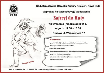 Klub Krzesławice Ośrodka Kultury Kraków-Nowa Huta(ul. Wańkowicza 17) zaprasza 18 września w godz. 11.00-16.30 do Krzesławic na trzecią edycję projektu Zajrzyj do Huty, którego głównym organizatorem jest Muzeum Historyczne Miasta Krakowa. W programie imprezy: zwiedzanie kościółka i młyna z przewodnikiem, wykład dotyczący Jana Matejki i związku artysty z Krzesławicami, animacje dla dzieci, zwiedzanie wystawy fotograficznej Krzesławice wczoraj dziś autorstwa Marcina Hueta.