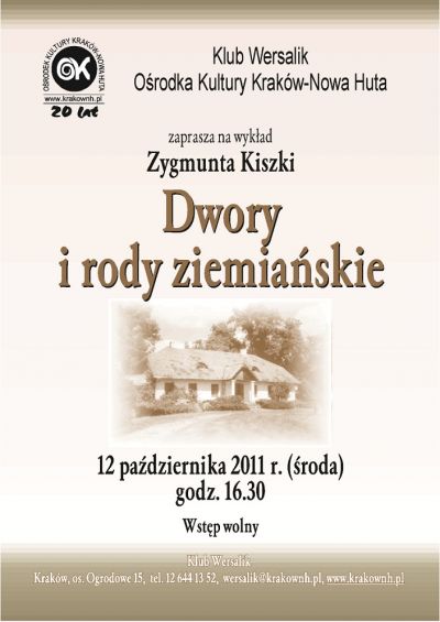 Klub Wersalik Ośrodka Kultury Kraków – Nowa Huta (os. Ogrodowe 15) zaprasza wszystkich zainteresowanych na wykład dr Zygmunta Kiszki o dworach i rodach ziemiańskich, który odbędzie się 12 października (środa) 2011 r. o godz. 16.30 w Klubie.