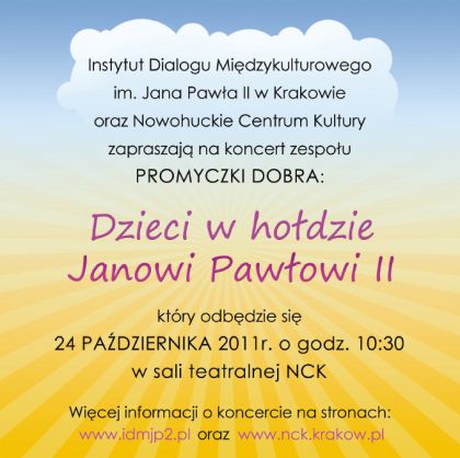 organizują koncert zespołu PROMYCZKI DOBRA w ramach obchodów liturgicznego wspomnienia błogosławionego Jana Pawła II 24 października 2011r. o godzinie 10:30 w sali teatralnej NCK.