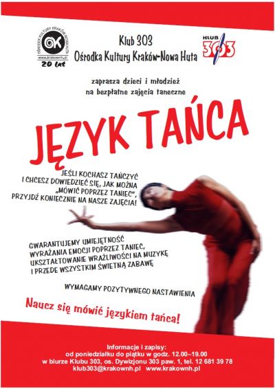 Klub 303 Ośrodka Kultury Kraków-Nowa Huta (os. Dywizjonu 303) zaprasza dzieci od 9 lat oraz młodzież szkół gimnazjalnych i ponadgimnazjalnych na warsztaty taneczne Język tańca.