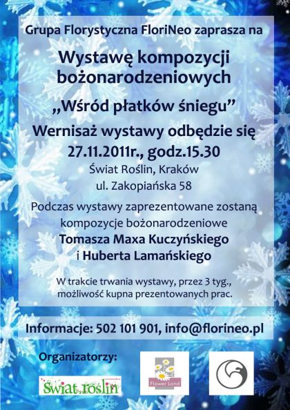 Zaproszenie na wernisaż wystawy, prac bożonarodzeniowych, którą organizuje Grupa Florystyczna FloriNeo, sklep Świat Roślin, Pracownia Florystyczna Flower Land Hubert Lamański, Agencja Florystyczna Tomasza Maxa Kuczyńskiego